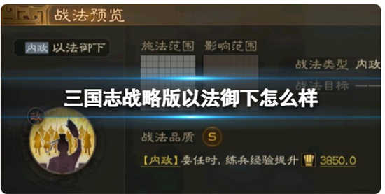 三国志战略版以法御下战法如何?三国志战略版是一款非常经典的沙盘策略手游,不管是在战略性、耐玩性以及公平性都非常强的体现,逼真的场景以及精美的人物造型,为玩家还原了一个真实的三国战场的沉浸式的真实体验,受到了广大的游玩玩家们的追捧。游戏的剧情非常丰富,玩家可以在这里体验到三国时期的各国将领角色的扮演体验,还有各种经典的玩法模式,为玩家带来优质的游玩体验。游戏当中战法的搭配是灵活多变的,只要你战法搭配的好,胜利就更加有所把握,很多玩家都非常好奇以法御下战法怎么回事?下面带来详情介绍。