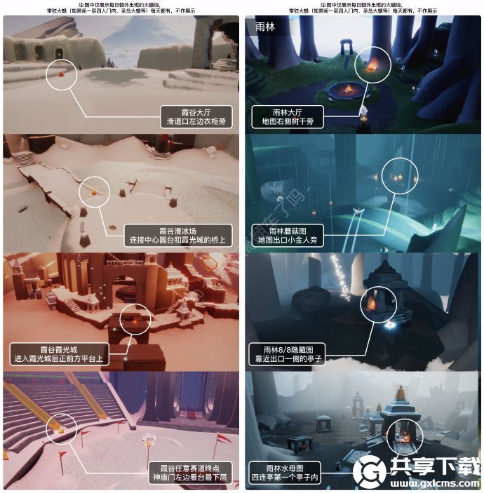 今日大蜡烛在雨林、霞谷,小伙伴们可以参考下图进行寻找: