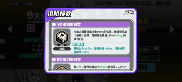 2、5星级效果预览:对敌方前排造成攻击105%的伤害。给目标添加[击碎]效果,防御属性降低15%→25%,持续2回合。
