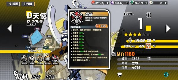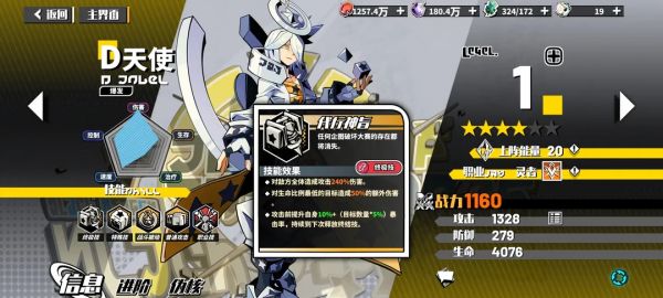 3、6星级效果预览:战斗中,提升自身20%→30%暴击率,10%→20%攻击力;对目标造成伤害暴击时,回复1点能量(每次行动至多回复3点),每次行动造成击杀时,额外回复1点能量;每次攻击造成暴击时,对敌方场上生命值最低的单位进行1次追击,伤害为D天使攻击力的120%(每次行动至多触发1次)。