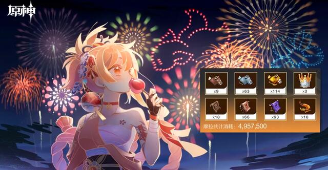 燃烧玛瑙碎屑×1、燃烧玛瑙断片×9、燃烧玛瑙块×9、燃烧玛瑙×6、阴燃之珠×46、鸣草×168、导能绘卷×18、封魔绘卷×30、禁咒绘卷×30、摩拉×2092530。