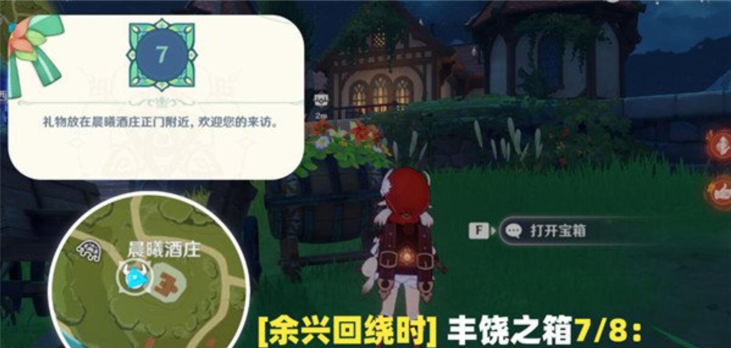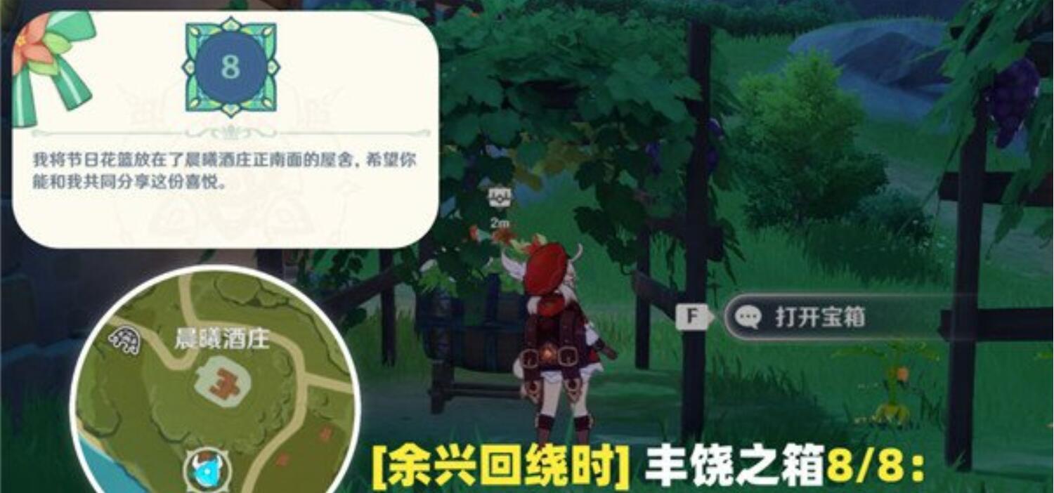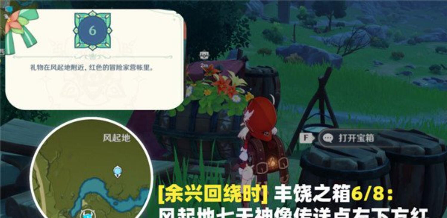 [余兴回绕时]丰饶之箱6/8:风起地七天神像传送点左下方红色冒险家营帐里面。