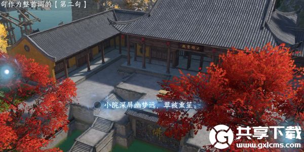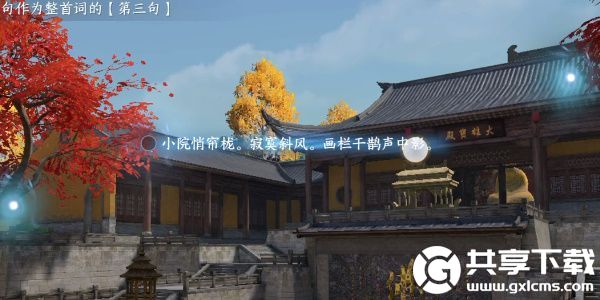 4、镜头再次移动点击中间光点由意象作出下一句(小院悄帘栊,寂寞斜风,画栏千鹊声中影。)。