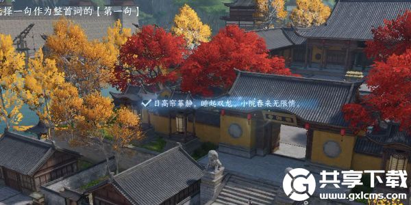 2、游戏中镜头移动,我们选择中间光点根据意象写出第一句(日高帘幕静,睡起双龙,小院春来无限情。)。