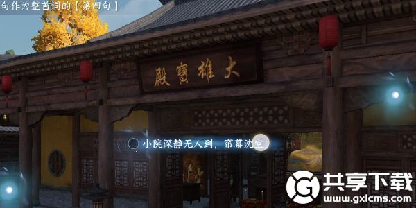 5、继续跟随镜头移动点击中间光点由意象作出下一句(小院深静无人到,帘幕沈空。)。