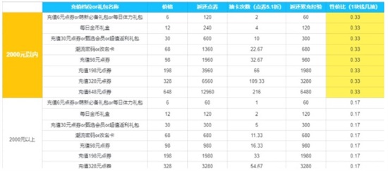表格中分为2000以上和以下的玩家群体,结合返利的来选择时候自己的氪金思路。