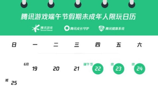 1、端午节期间未成年人游戏时间分别为:6月22日~6月24日每天晚上的8:00-9:00,每天可以玩一小时,加起来总共有3小时游戏时间。