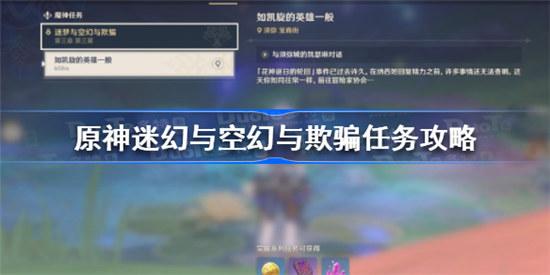 原神迷幻与空幻与欺骗任务怎么完成?原神很好玩的动作冒险游戏,多样的玩法体验,玩家在游戏中可以体验到很多的乐趣,还有高度自由的地图探索玩法,玩家可以探索各种地图,获取很多的资源,完成游戏的任务还可以解锁精彩剧情,游戏的剧情还是很棒的,玩家在探索游戏的同时,还可以挑战强大的boss,这些boss会有很多的奖励掉落,其中角色培养需要的道具都可以通过击败boss来获取,给玩家带来很多的玩法选择,游戏的迷幻与空幻与欺骗任务很多玩家不知道怎么完成,小编这里整理了相关的迷幻与空幻与欺骗任务攻略,还没完成这个任务的小伙伴可以来这里看看攻略。