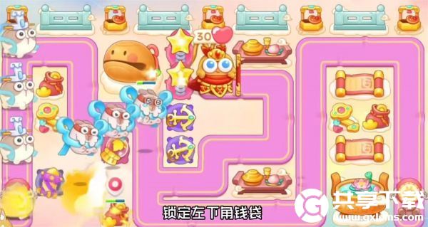 4、卷轴清理掉之后,在左下角建一个三级烟花,锁定左下角钱袋,打掉之后在中间的位置建一个三级星星,锁定桌子;