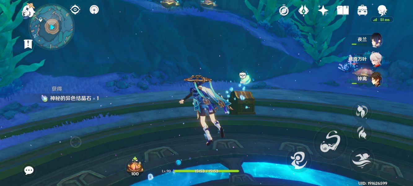 2.图中常态攻击·水泡的移动速度较慢,比较好躲,留足耐力冲刺即可;但这一攻击的伤害较高,躲闪不及的话很可能会掉很多血。(我4w6的帝君粗略估计可以挨三四下)