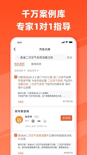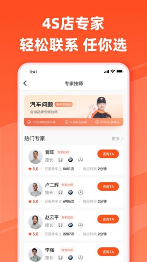 目前已经拥有9万名通过汽车大师认证的专业4s店(5年以上经验)汽修技师,覆盖所有主流汽车品牌。专业,快速解答车主汽车维修、保养、用车等汽车问题。